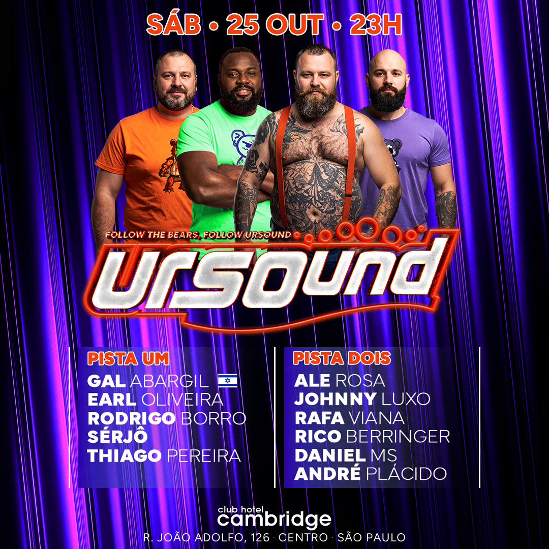 A Festa Ursound é um Espaço para Todos os Tipos de Ursos, Bears, Amigos, Jovens, Maduros, Coroas, Chasers e Admiradores se encontrarem, são vários DJs e o som mais democrático da cidade num ambiente com duas pistas, lounges, mezanino e vários bares!