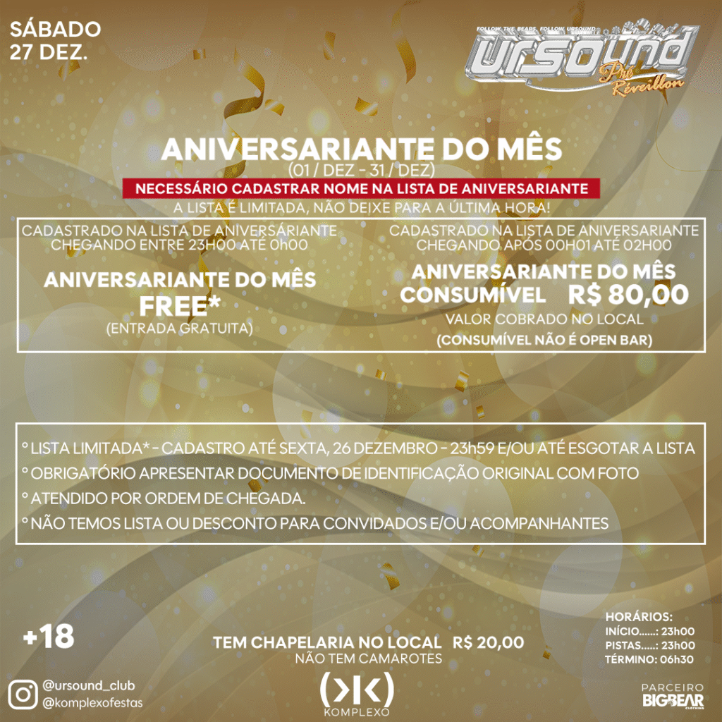 LISTA VIP ATÉ 0H30, APÓS ESTE HORÁRIO >>> Consumível $80