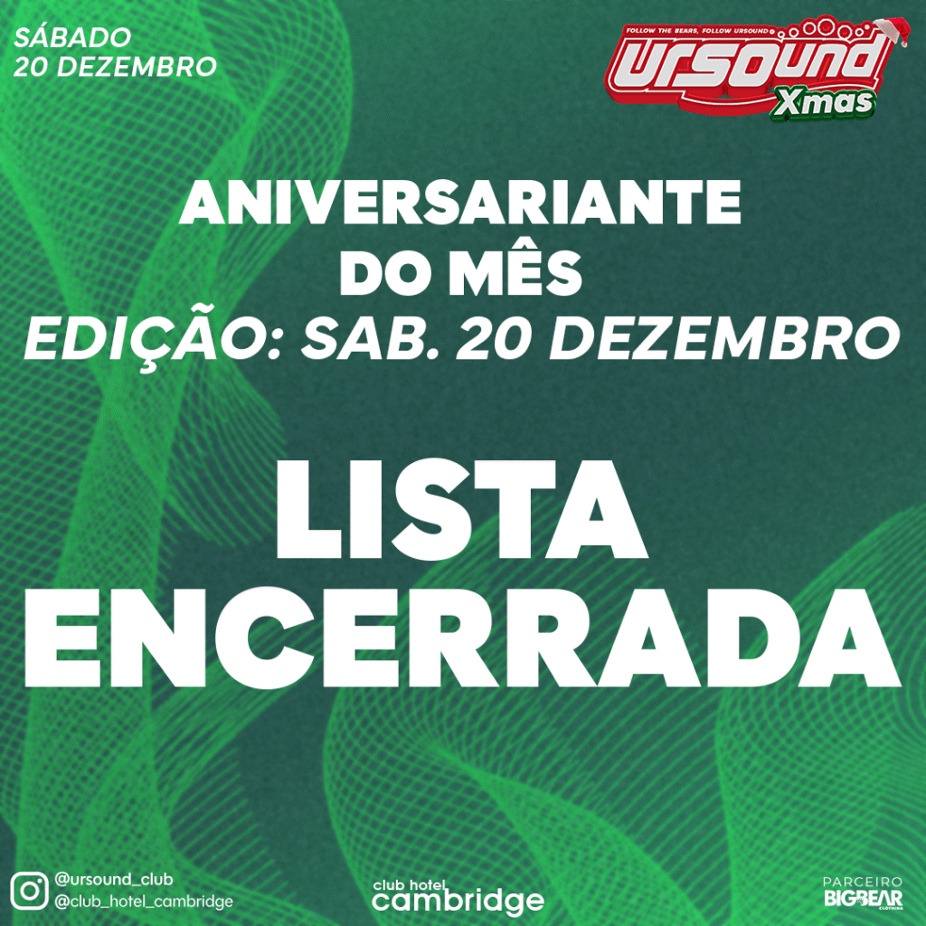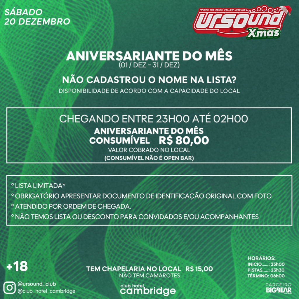 SÁBADO, 20 DEZEMBRO – 23h – Club Hotel Cambridge