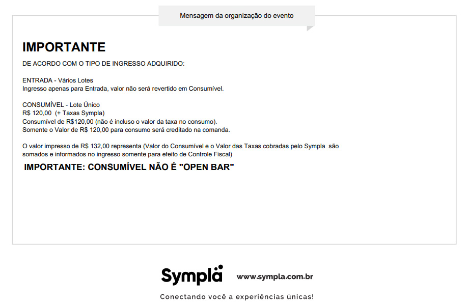 Comprou Ingresso Consumível –> R$ 120,00 (+10% Taxa Sympla + 2 a 2,5% Taxa Processamento Sympla )