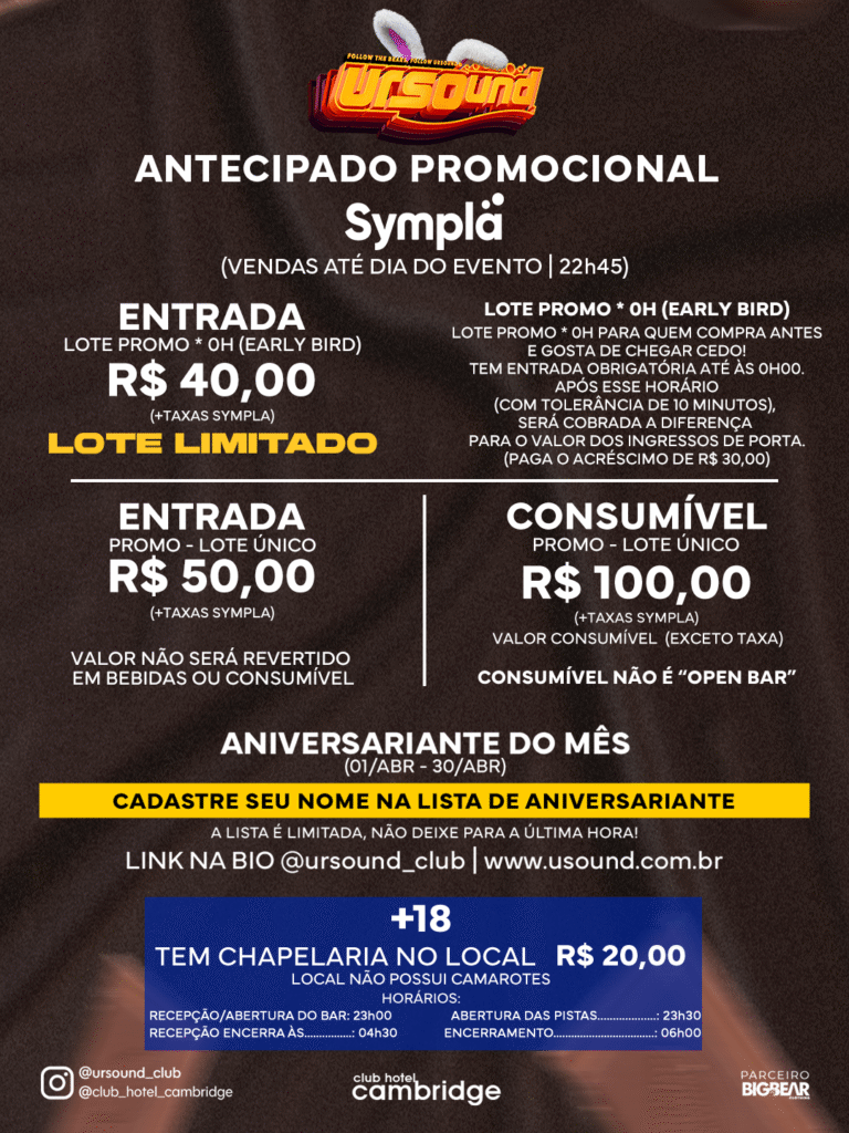 Vendas no Sympla até 23h ou até esgotar o lote.