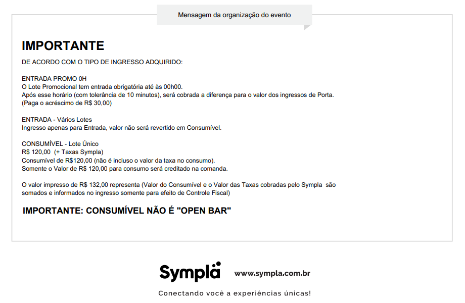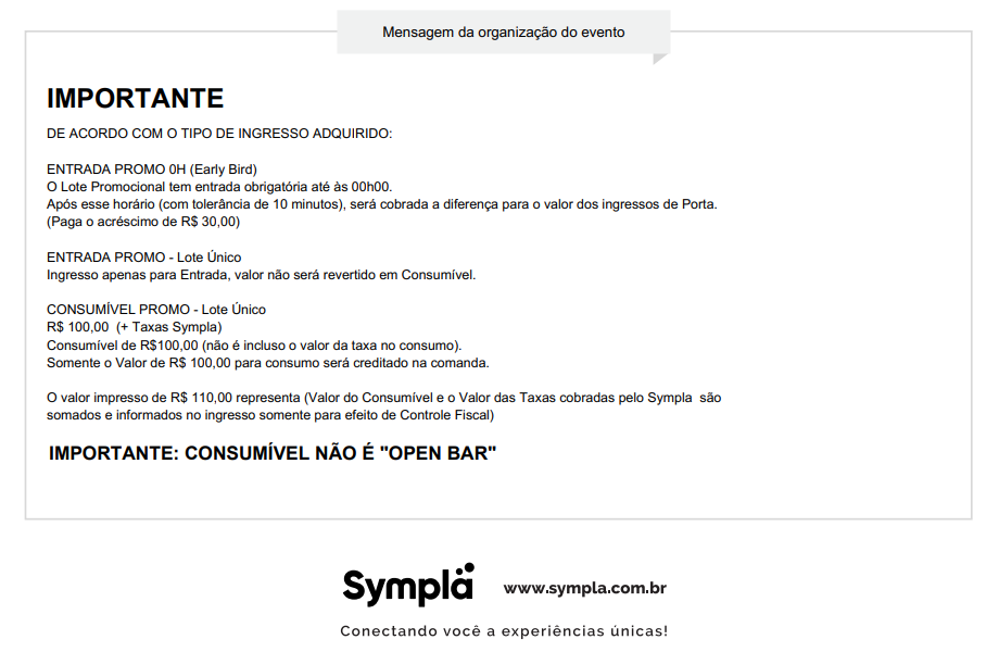 Comprou Ingresso Consumível –> R$ 100,00 ou R$ 120,00 ou R$ 150,00 (+10% Taxa Sympla + 2 a 2,5% Taxa Processamento Sympla )